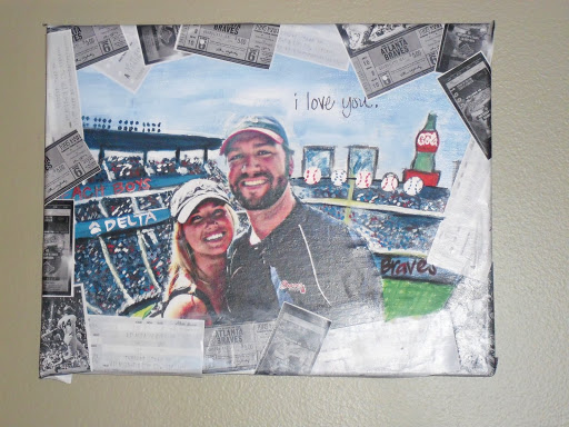 I used a photo from one of our first dates at a Braves game on Memorial Day last year. We had so much fun together that day and still talk about it to this day. I blew up the pic, cut us out and mod-podged us to a canvas. I painted in the background and then made a border out of pics of vintage Braves tickets. I think he was really surprised to get a painting from me and didn’t quite know what to think, but he immediately hung it on his wall and that made me feel really good. 🙂