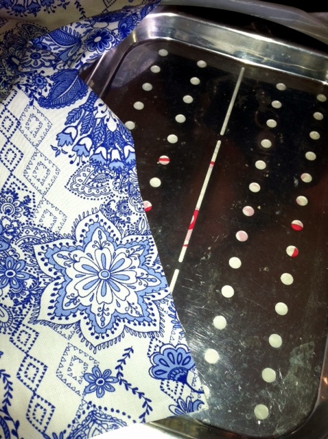 pretty simple project. we covered this $2 goodwill cooking pan with fabric using spray adhesive