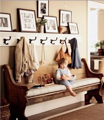 I scored a similiar bench from CraigsList {“I know this guy named Craig, and he has this list”}. Once I get that {Hopes & Dreams!} house I want to re-create this area in my entrance. Love the hooks, the shelf, the pictures, the bench cushion, the kid! {wait…slow down, amc}
