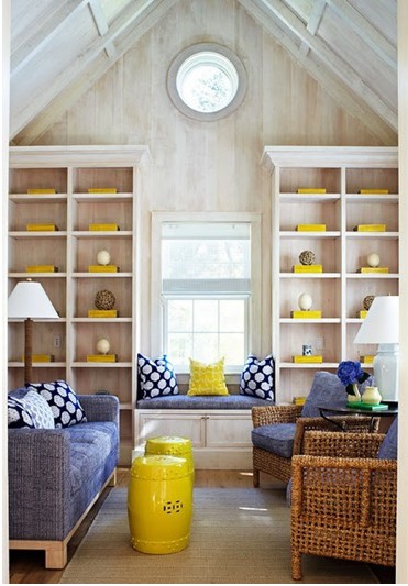 This image hangs on my wall in my office. I love the book shelves {but what a waste, don’t they have more books?!}, the colors, the lay-out and those to-die-for high ceilings. Plus a  great window seat nook! {Dreaming of Cory Matthews starts now}