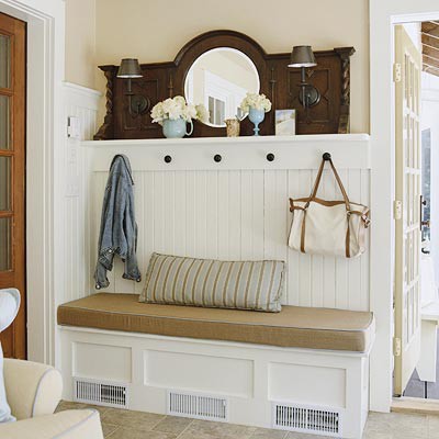 What a wonderful mini-mud room. I like how they classed it up with traditional home accents to give it a more inside, formal look.