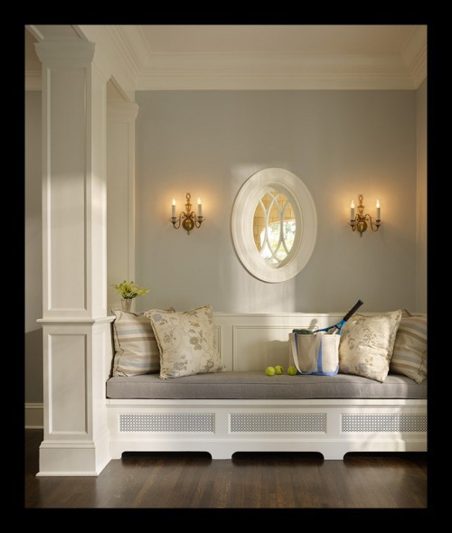An entry-way bench for the rich and fabulous. I will probably never have anything this wonderfully customized in my home, but hey- this blog is about dreaming right? 🙂 P.S. Excellent wall color!