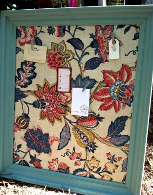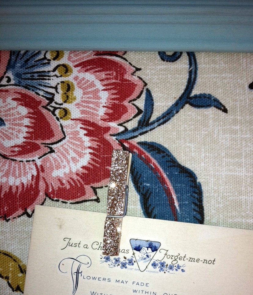 i love this idea of framing a piece of tin underneath a piece of great fabric- makes for a perfect message board! bonus points for the itty bitty glitter paper clip magnets