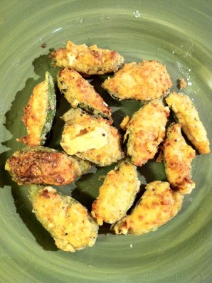 Pepper Poppers! Josh’s dad gave us some peppers to experiment with and I think I did them proud! They are stuffed with a savory cheese blend and perfectly golden brown thanks to Josh!