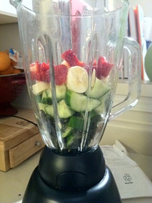 Load up the blender with kale, cucumber, bananas and strawberries
