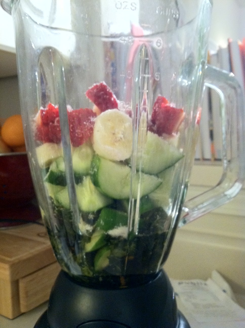 Load up the blender with kale, cucumber, bananas and strawberries
