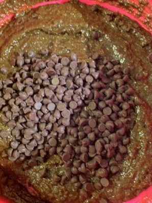 Now go ahead and add those dark chocolate semi-sweet chips. I won’t even tell you how much 1/4 cup, you be the judge here. Live it up.