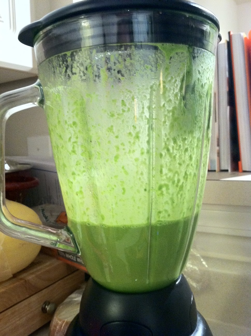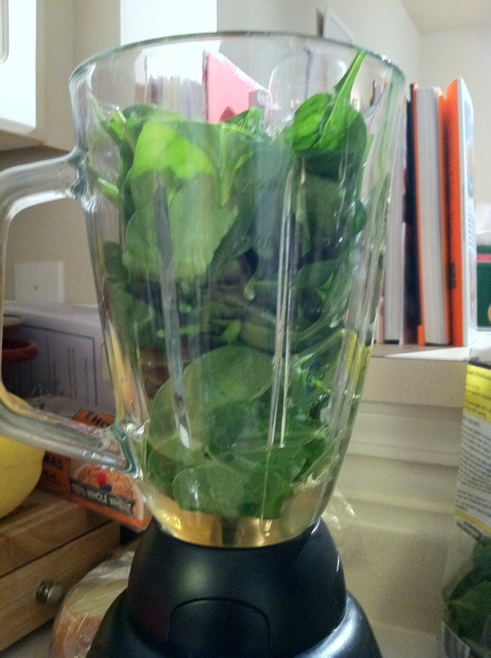 Blend up: 1/2 cup water, 1/2 cup extra-virgin olive oil, 1 teaspoon pure vanilla extract, 2 cups raw spinach