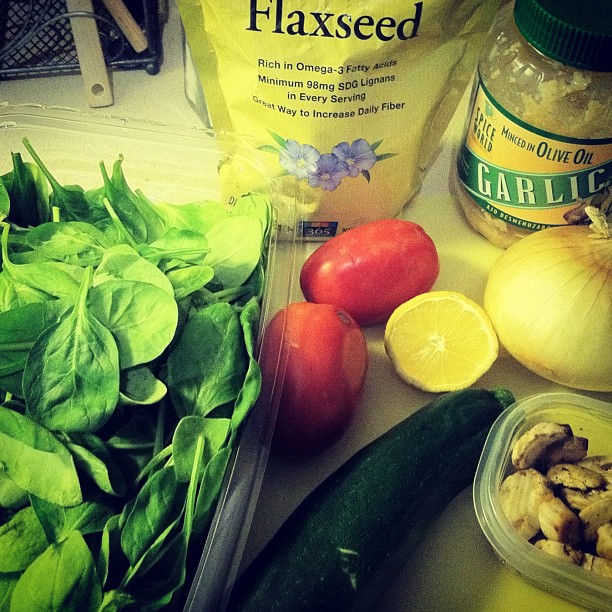 The cast of characters: baby spinach, tomatoes, mushrooms, garlic, onion, lemon, zucchini and flax seed