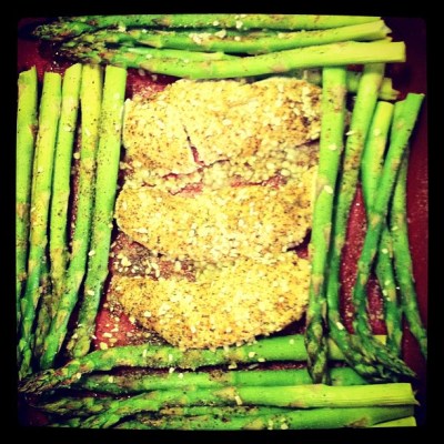 Another go-to recipe is baked chicken and asparagus. EVOO, fresh lemon juice, minced garlic, onion flakes, Mrs Dash