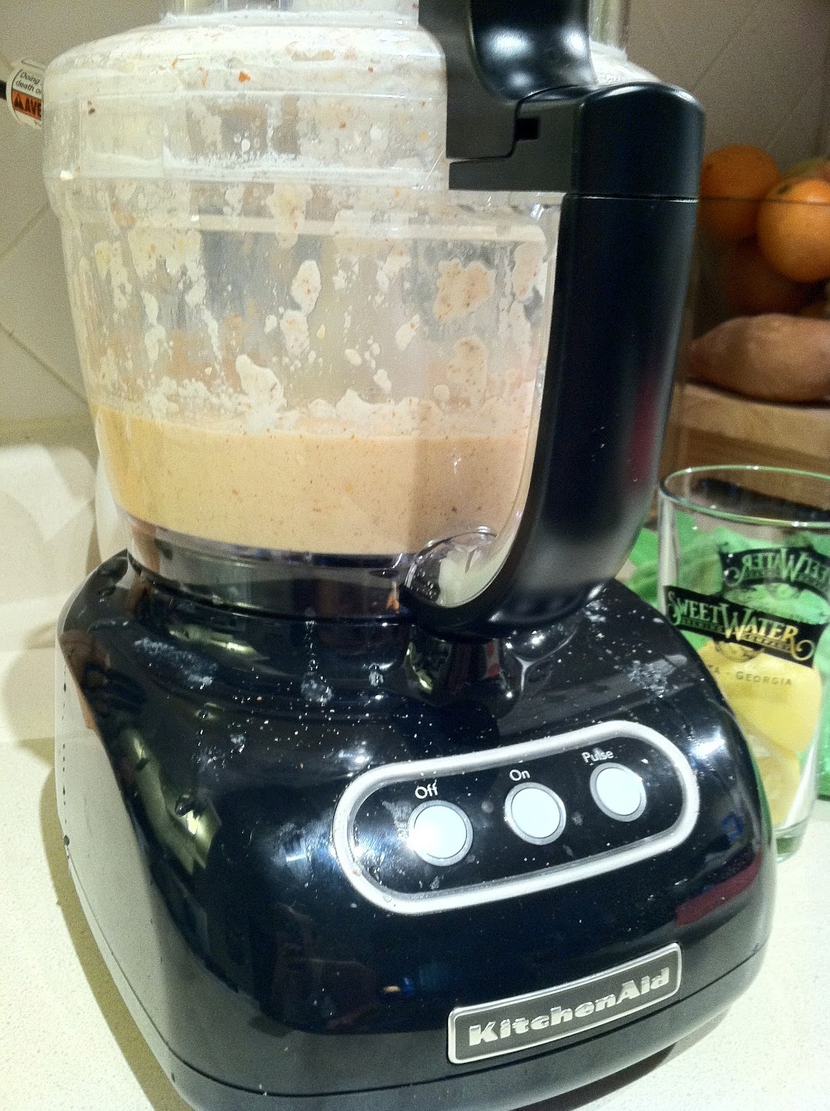 Nutty Garlic Sauce! Thanks to the brand new KitchenAid food processor!!! 2 garlic cloves, water, honey {or agave}, 2 cups of almonds and 2 cups of cashews. Process until smooth and saucey thick. Add more water if needed. P.S. this made a TON!!! We will be eating it for weeks….