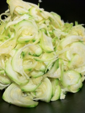 The spiral slicer is super easy to use and makes fun little strings of veggies! We {Josh helped with this recipe} used four zucchinis and after some trial and error we got the hang of it and ended up with a giant batch of raw zucchini pasta “noodles”!
