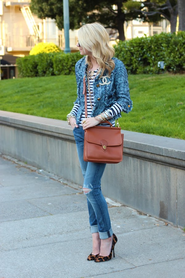 why of course ripped up jeans and Chanel go together. bonus if you throw in some point toe leopards.