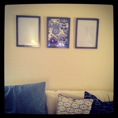 I used 3 old ikea frames and spray painted them glossy gray {to match the art over the fireplace, our rug and some other accents in the room} then filled them with scrap fabric.