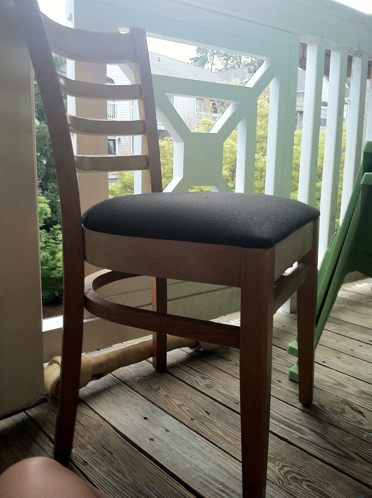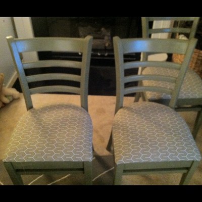 The chairs were then sanded down and painted a lovely green color. Then my handy fiance discovered his best kept skill. Upholstery! That man can work a staple gun.