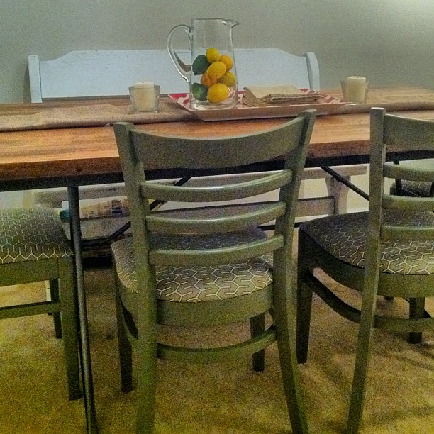 We scored 4 wooden chairs with cushions that were in great shape from Goodwill for $40! I knew it when I saw them that were full of potential and I probably couldn’t get chairs for less expensive.