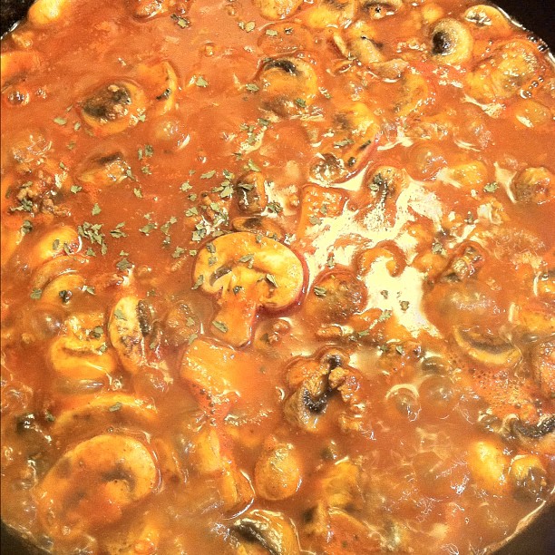 Mine consists of 1/2 pound turkey meat, 1/2 pound lean ground beef, 1 package of sliced mushrooms, 1 can of organic tomato sauce, italian seasoning, minced garlic and onion flakes. Brown the meat with some garlic and herbs, then add in the mushrooms so they can get tender. When ready add in more herbs, seasonings and the tomato sauce.