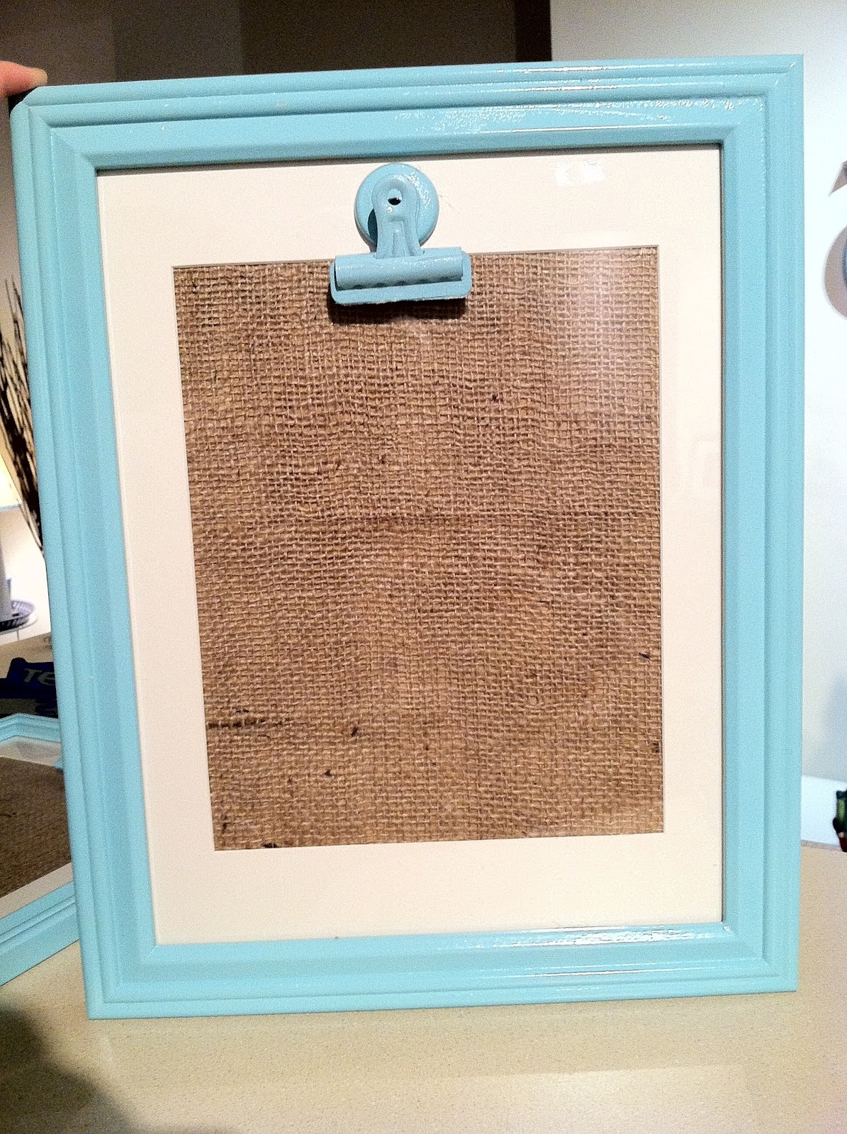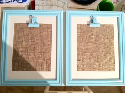 Two old {or inexpensive} frames, glossy spray paint, scrap burlap and magnetic clips.