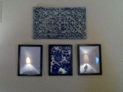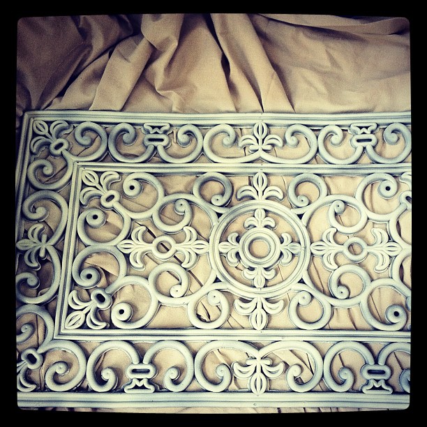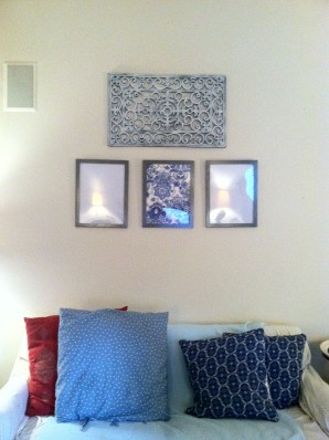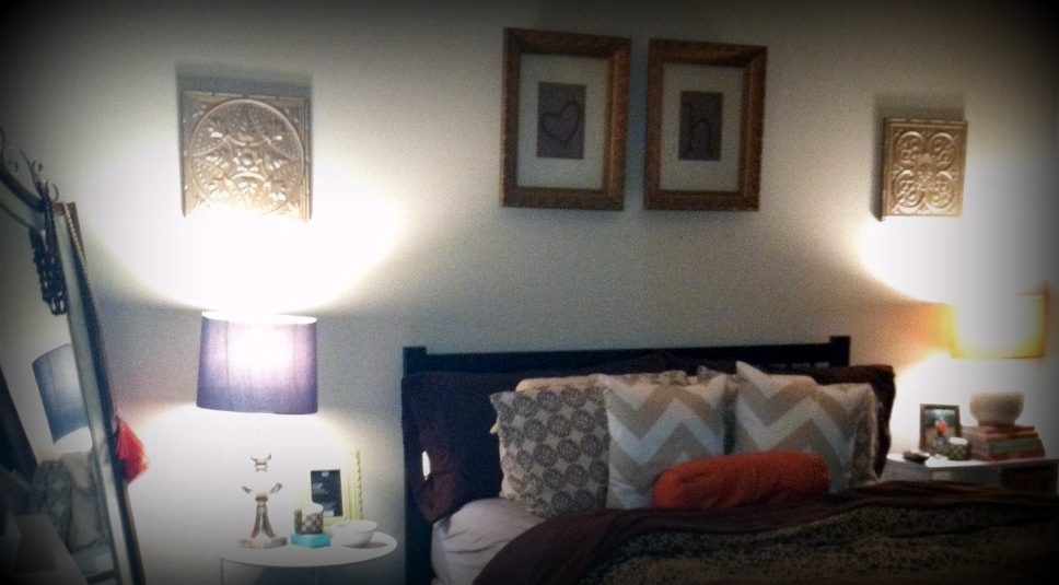 The 2 metal art pieces above the lamps were formerly rustic red, but a coat of champagne colored spray paint makes them perfect for the bedroom at a fraction of the cost of new decor.