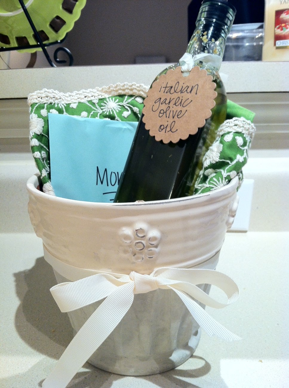 homemade Italian garlic infused olive oil, fancy apron and flower pot