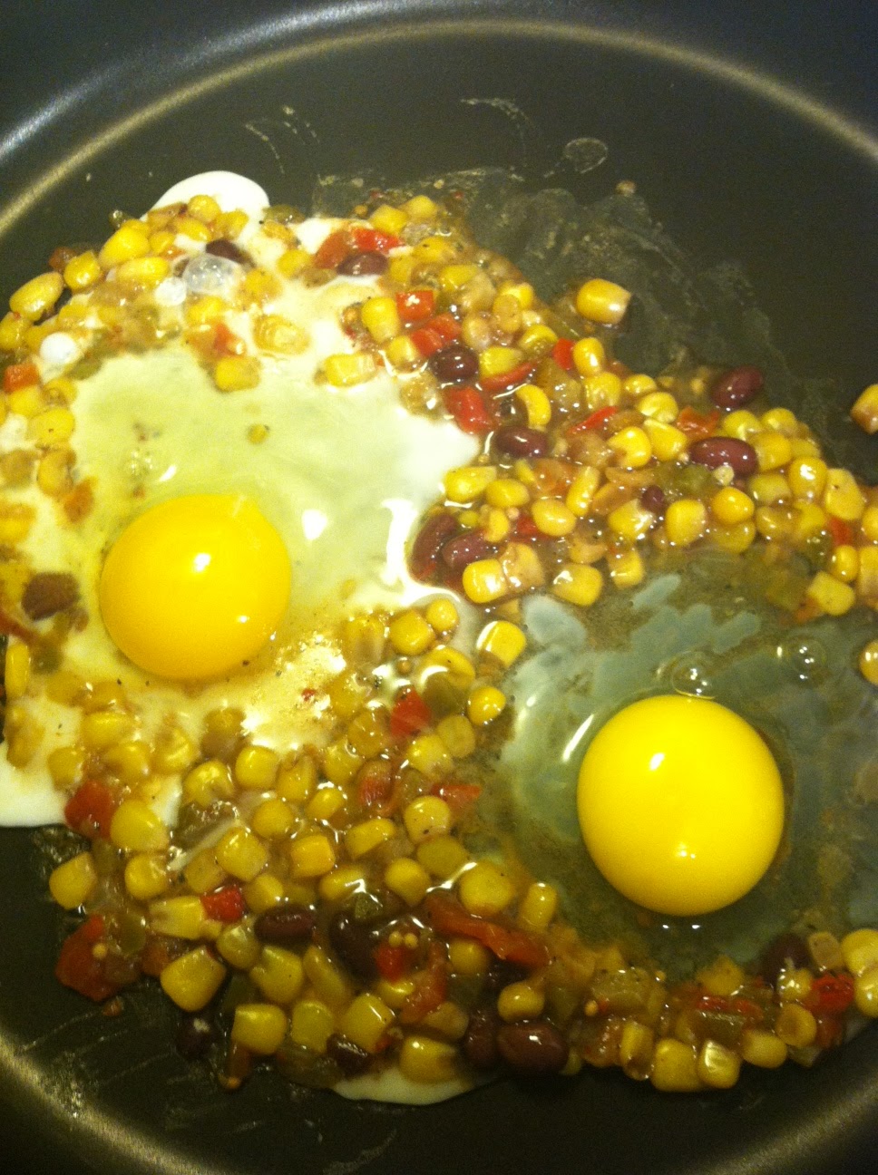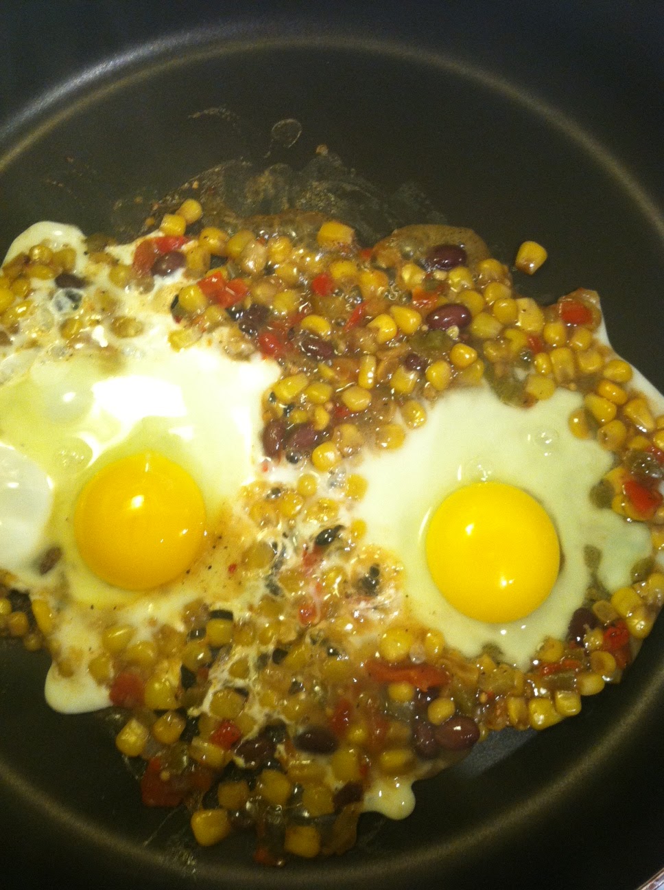 In a saute pan, heat up your salsa and create two circles/holes in the spoonfuls