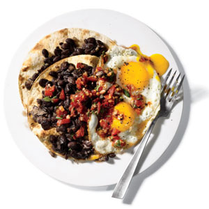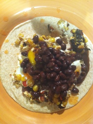 Assemble your mexi creation: warm totilla, egg and salsa then top with warmed black beans and hot sauce