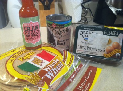 Grab these: whole wheat tortillas, organic black beans, salsa {not pictured}, eggs and hot sauce