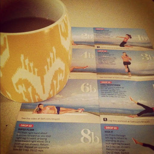 The thing that I have had the most difficulty with lately is doing my morning cardio. I’ve gotten sucked into a routine of late night errands and trashy tv which makes getting up at 6 a.m. not so easy. If I can’t get into the cardio kick, then I pop in my Beach Babe DVD or grab my Self Magazine TIU cards {+ a coffee from our new Keurig!} . As long as I am moving in the morning, we are set for success!  I am hoping to get back into the early morning cardio habit again soon.