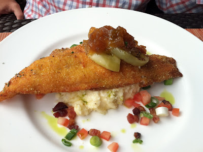Josh, the country boy, chose catfish and grits. He loved it! Perfectly breaded, precisely cooked and topped with a tasty green tomato apple relish with bacon. After months of clean eating. he was one happy boy.