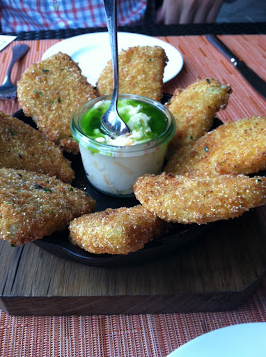 Fried Green Tomato Pickles with Alabama Pimento goat cheese and jalapeno pepper jelly