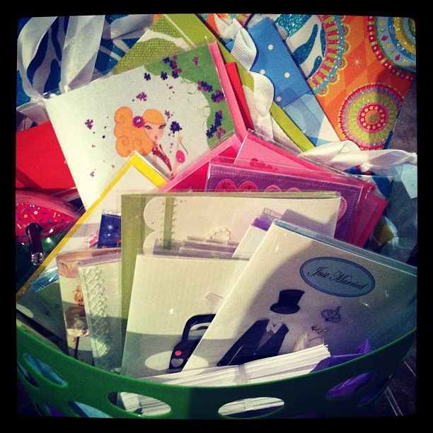 The things you will do for a discount…I dragged sweet Josh to Swoozie’s on Sunday so that we could get a “bridal discount card” for all purchases made up until our wedding. Low and behold while we were there, I was the lucky winner of a GIANT basket of cards, thank you notes and gift bags! Yipppee!