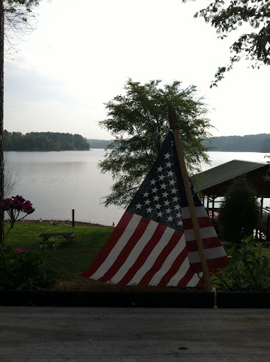 an early morning look at the lake with our cute flags all around