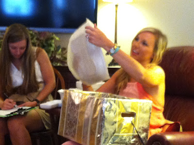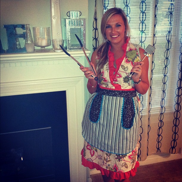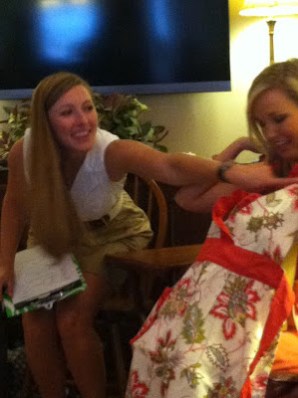 Lyds {maid of honor!} showing me my NEW MONOGRAM on my new apron!