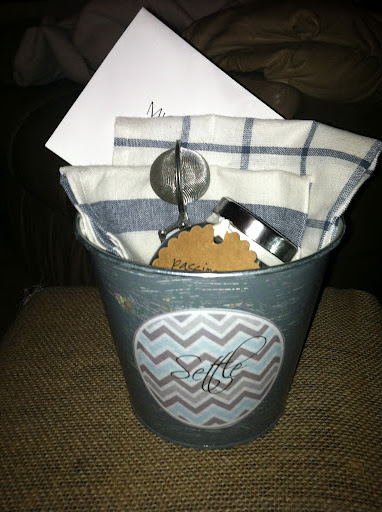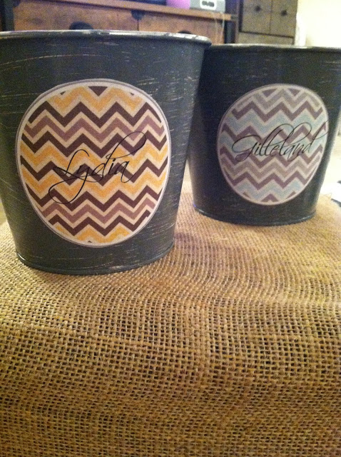 I started with some printed pails from IKEA. I hated the print, but loved the price and the size, so they came home and got a coat of gray paint and fun chevron label {made by me using Word! Easy!}. Coat in Modge Podge and the pails were ready to be filled with goodies!