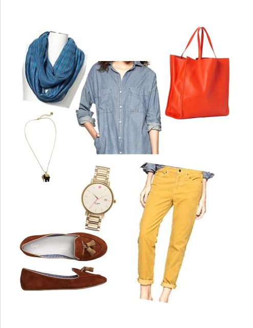 Pinstripe Infinity Scarf | 1969 Chambray Tunic | Leather Travel Tote | 1969 Sexy Boyfriend Cords | Tassel Loafers