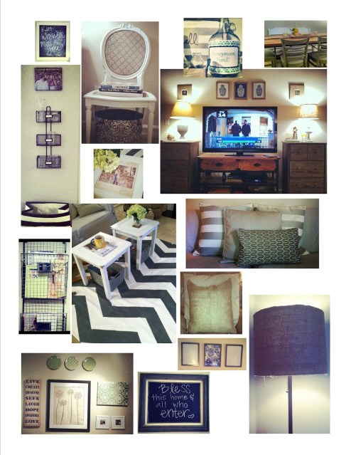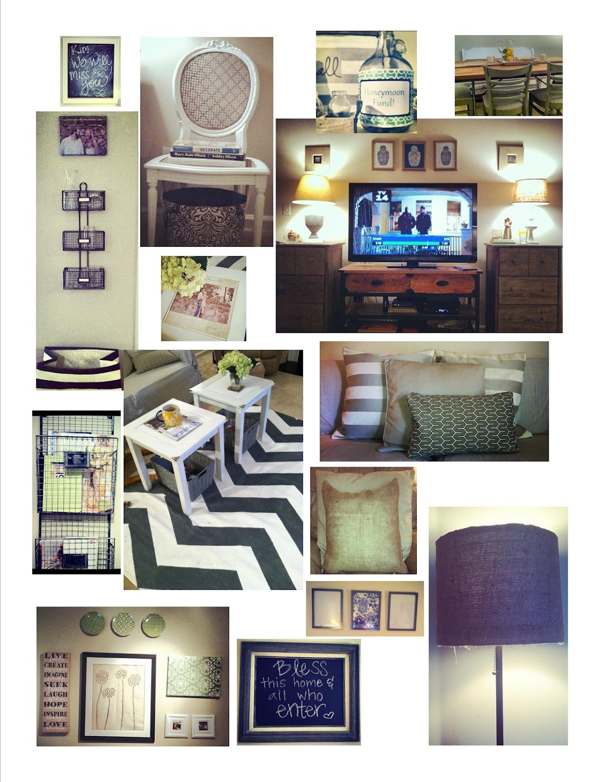 Kitchen Chalk Board | Goodwill White Washed Chair | Honeymoon Fund Jar | Dining Room Table + Painted & Uphostered Chairs | Striped Bag + Wire Shelf Boxes | White Wash Coffee Tables + Engagement Photo Book | Media Set-Up + Storage Side Tables | Wire Magazine Rack | Painted Chevron Rug | Beige Pillow Cluster | Burlap Pillow Pair | Green Themed Wall Vignette | Guest Room Chalkboard | Fabric Wall Art | Burlap Lamp Shades
