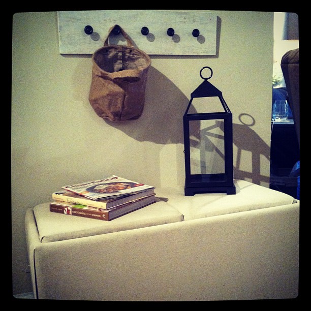 What was once a manly leather ottoman is now a more marriage-friendly linen covered ottoman. Perfect for storage and little stylish vignettes. It currently looks much more chic than in this picture…but I don’t have picture proof. Nail head trim is en route to the Hall household that will give this ottoman some french finesse. Splendid!