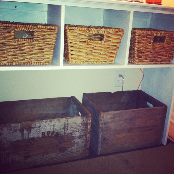 I did score exactly what I was looking for- 2 vintage wooden wine crates. We picked through the stacks to find ones with worn colorful paint, metal detail and engraved branding- the more character the better. Our lovely crates are perfectly nestled underneath our new entry way table and have become the home to shopping bags and house shoes among other items.