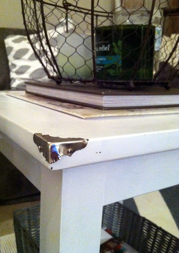 We found these metal corner caps on Amazon.com–very inexpensive and reasonably easy to install {ish…}.