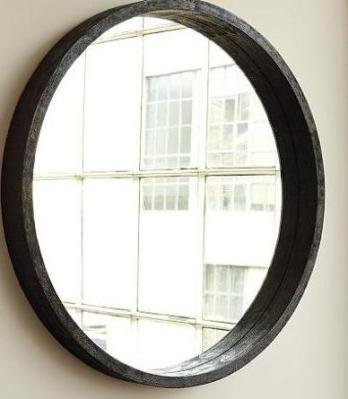 The mirror is about 30+ inches in diameter and features a black wood lip/frame about 2 inches in width.