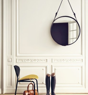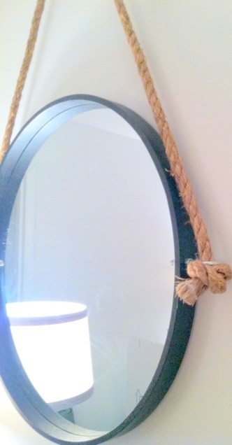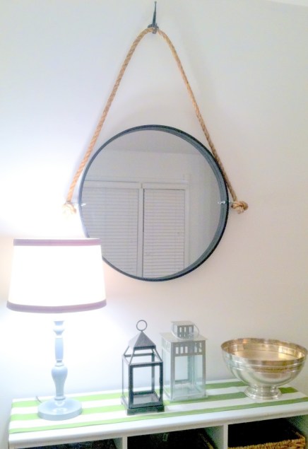 My inspiration came from these images, especially the Restoration Hardware version that uses rope. I like the rustic, nautical and natural vibe that the thick rope provides. However with a price tag of $650 that mirror would not be mine. Just days after longing over these images I spotted a large round mirror with a black frame at HomeGoods, I knew we could recreate on our own!