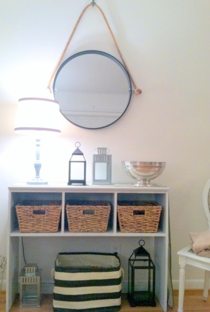 For now one of the walls is home to our former entry way table. It was sad sitting there all alone, so we framed it up with an amazing captains mirror that we made ourselves!