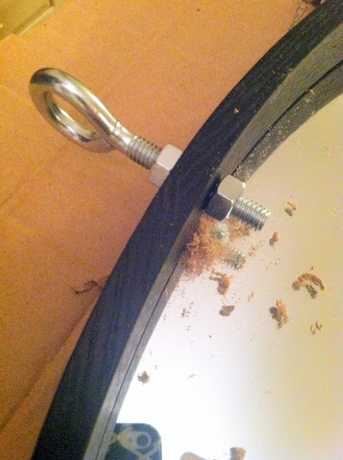 Drill {or have your dad drill…} your holes with a bit compatible to the size of your eye bolt.