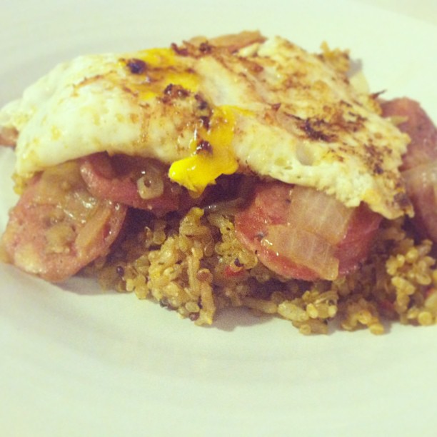 With some coaching from the Hall household’s egg frying champ, I fried my first egg last night. Then I topped that delicious thing on a stack of Quinoa, Sauteed Onions and Chicken Apple Sausage.