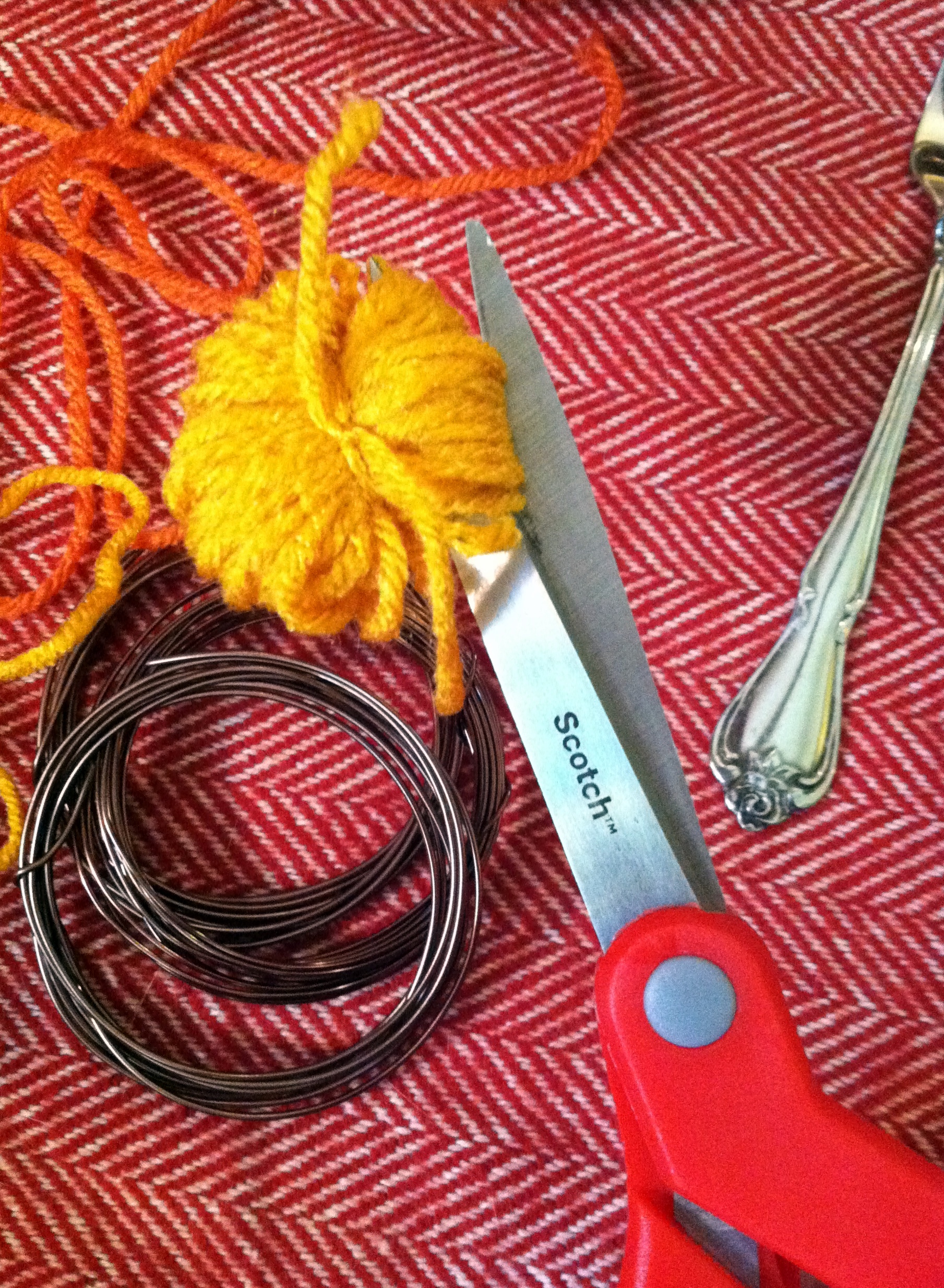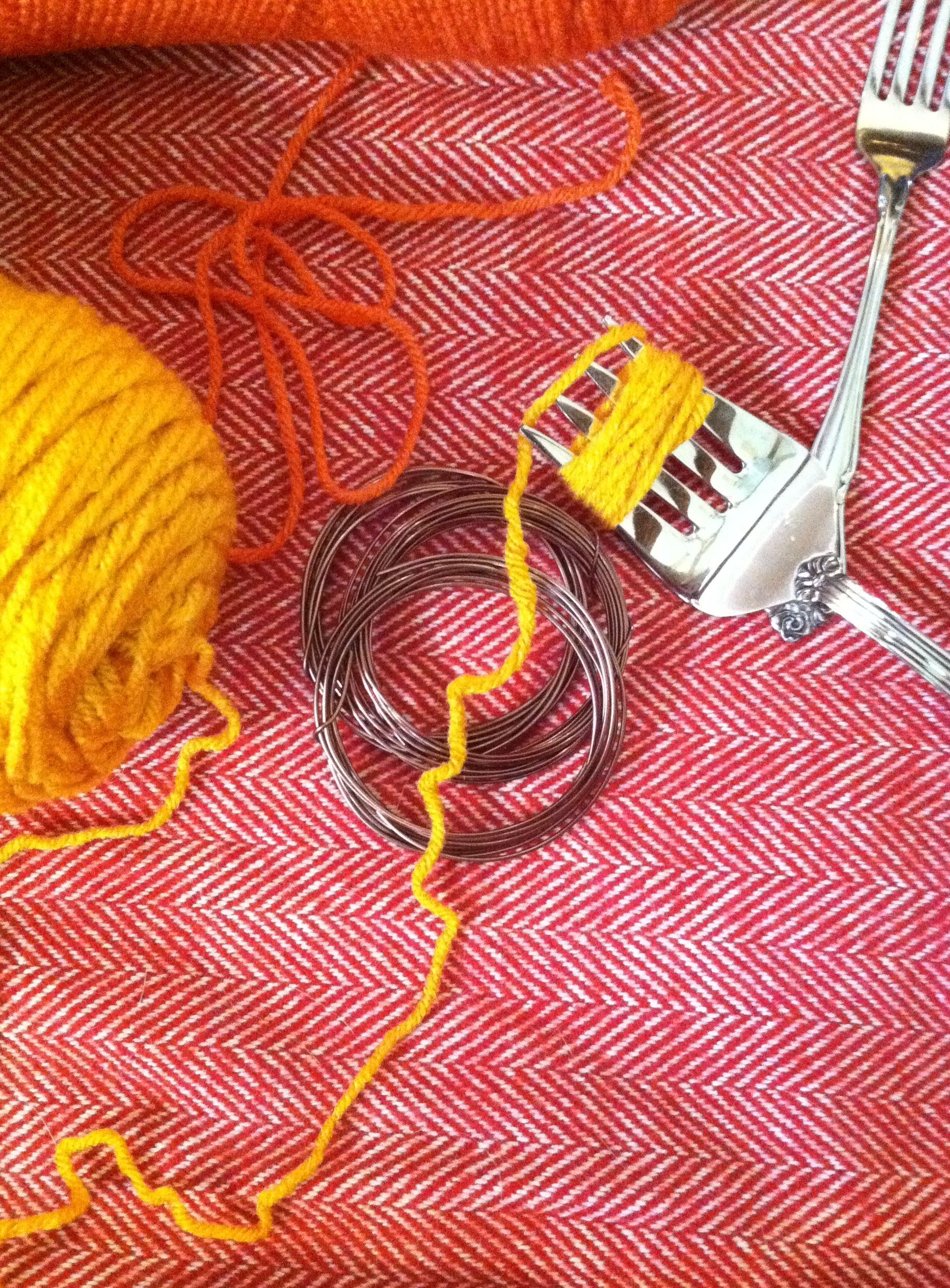 I used gold and carrot colored yarn, bronze/brown craft wire and two sizes of forks- dinner and serving.