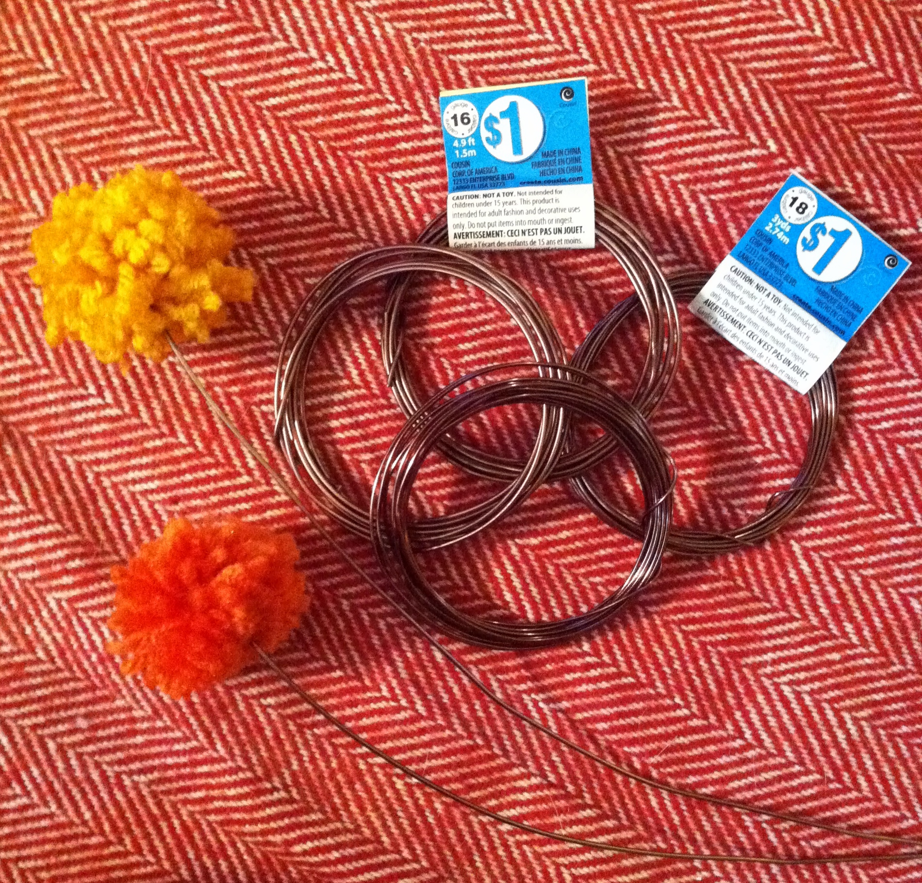 No need for gluing or tying knots…just stick the wire into the center of the pom pom and you have stems! Cut the craft wire at different lengths and consider connecting stems by twisting together. I used 16 and 18 gauge wire which is quite flimsy, but that was all that was available. This product would’ve been PERFECT and much cuter!