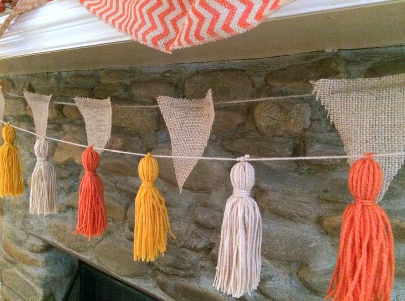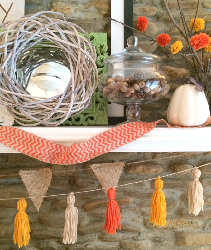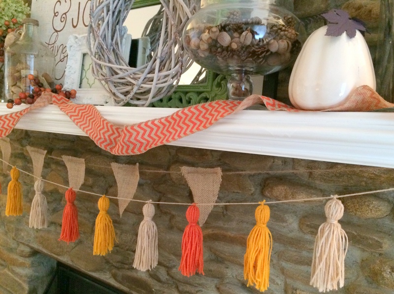 To bring the beauty of fall indoors I typically decorate with vases of acorns and pinecones, I tie burlap ribbons around the house and bring out as many white pumpkins as I can. This year I got crafty and added a bit of whimsy to the mix- inspired by this type of garland, my obvious tassel obsession and some extra yarn I had from this DIY Pom Pom Tree project – I put into action an idea I have had all season.