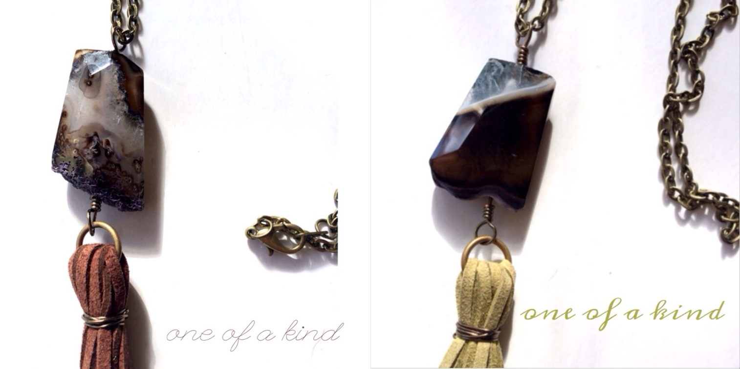 Uncomfortableness aside {but not really though…} I really really love these two one-of-a-kind tassel necklaces. The stones are so beautiful and unique it makes me crazy! I paired each of them with different color tassels than I normally use- they are so pretty together!