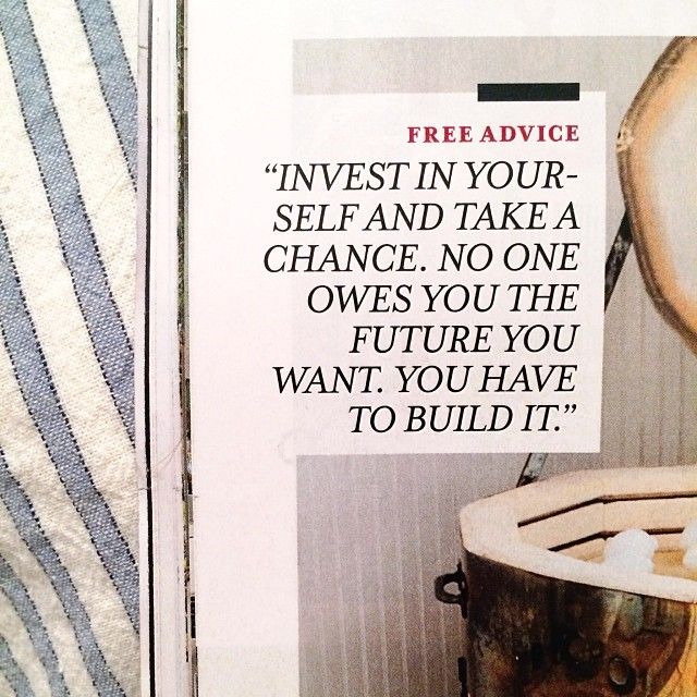 HOPES & DREAMS: free advice Posted on November 12, 2014September 23, 2015 by amandamacyhall I posted this about a year ago – but it’s a good one that deserves reposting, internalizing and acting on. “INVEST IN YOURSELF AND TAKE A CHANCE. NO ONE OWES YOU THE FUTURE YOU WANT. YOU HAVE TO BUILD IT.” { Source: Country Living Magazine, 2013 } Share this: Click to share on X (Opens in new window) X Click to share on Facebook (Opens in new window) Facebook Click to share on Pinterest (Opens in new window) Pinterest Click to email a link to a friend (Opens in new window) Email Click to print (Opens in new window) Print Like Loading... Related