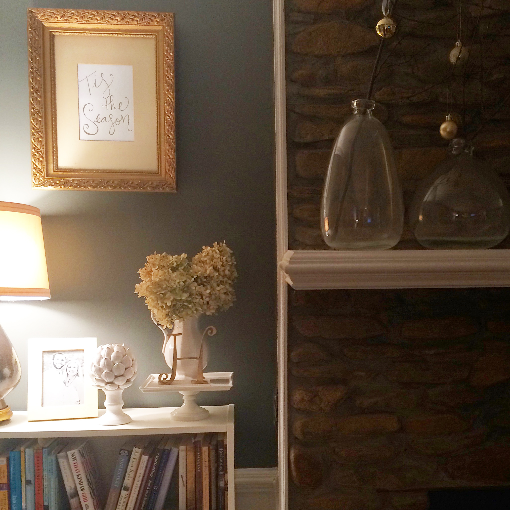 Merry Christmas! The Hall’s have begun decking the halls! {I’ll get tired of that, right?} The mantle is bothering me, so I am focusing my efforts elsewhere. These two gold frames flank our fireplace and were my first-ever score from the innagural Country Living Festival in Atlanta. I spotted them immediately and carried them around with an accomplished smirk on my face all day. The size is just right, the thick detailed frame makes such a statement, and the beautiful patina gold glows against our deep gray walls.